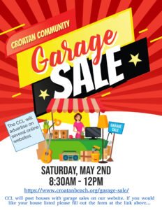 The sale will be held on Saturday, May 2nd from 8:30 AM to Noon PM. At your option we can add your address to a list of Croatan neighbors who will be having a yard sale on this date. A list of addresses with the categories you selected will be advertised via theCCL web site, Facebook, and Nextdoor. We will also post announcements on various yard/ garage sale websites. You would be responsible for any additional advertising and signage to your personal sale.